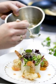 Frukosten inbjuder till att sitta länge och det finns inte något jag saknar. Allt finns smakfullt uppdukat bara för dig. I köket erbjuder Oliver kvällens meny, à la carte och så har de även satsat på lokala rätter. Jag kan inte motstå Katjas rekommendationer och startar med en riesling- och ostsoppa med en bakad jätteräka. Innan dess bjuder köket en liten aptitretare och in kommer en färgglad komposition av gös på spenatbädd, paprika och tomatmousse och en liten krämig soppa som alla sätter igång smaklökarna.