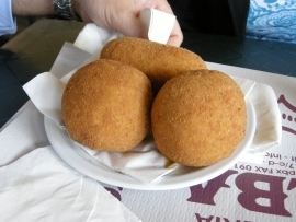 Det är mysigt att sitta här och beställa in lite småplock som skinka, mortadella och ost till ett glas vin. Har du tur hatr de även sina små "little orange" som är en friterad "risboll" fylld av kött eller ost/skinka. De har fått sitt namn efter sitt utseeende då de liknar Siciliens berömda apelsiner. Mättande och ack så goda efter några timmar på staden!