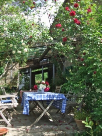 Trädgården ligger underbart placerad runt huset med utsikt över dalen och bergen. Här hittar du över 150 sorters rosor och en mängd fantastiska blommor. Det är drömmen för den trädgårdsintresserade.